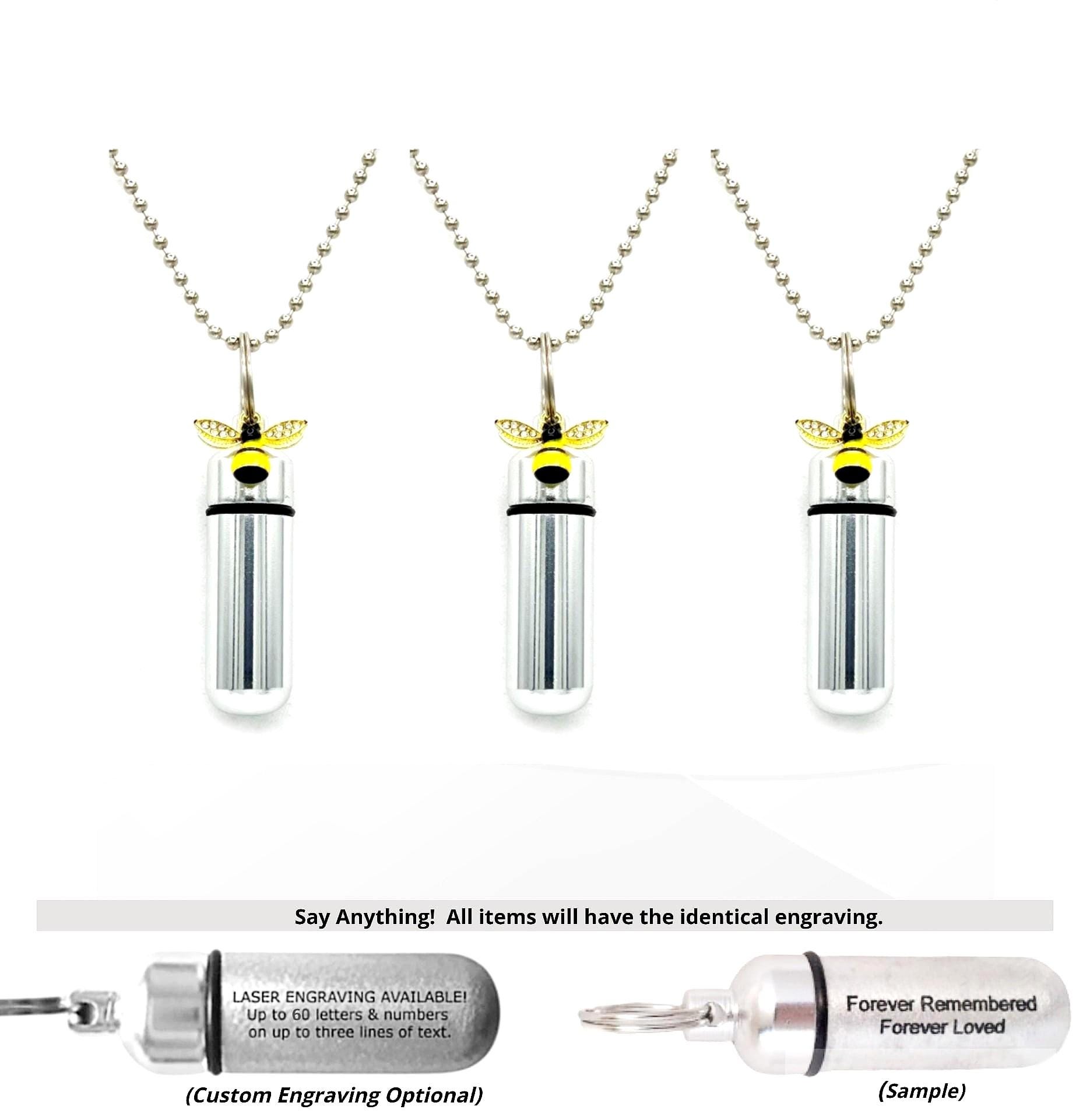 YOU GET THREE CREMATION URN NECKLACE KEEPSAKES, THREE VELVET POUCHES, A FILL KIT, AND THREE STEEL 24" BALL CHAINS.