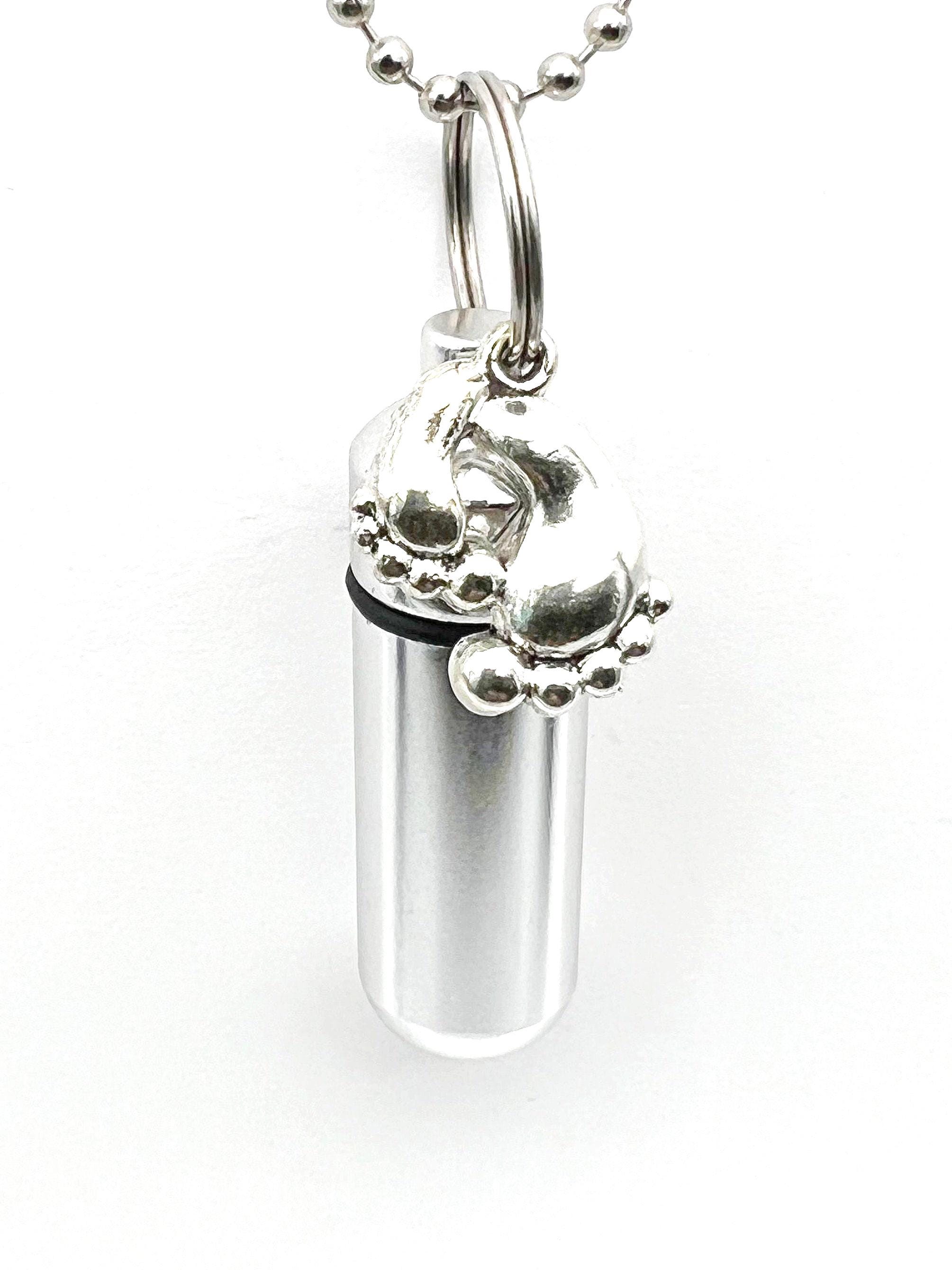Silver Cremation Urn & container with Silver Baby Feet. Hand Assembled.... in Black Velvet Pouches KEYCHAIN / PENDANT / LOCKET Sturdy, discreet, and secure, this Urn is 1-3/4 inches tall and has a small clear container inside to hold a small amount of your loved ones ashes. Keep them close to you always. It is made of aircraft grade anodized aluminum, and will virtually last forever. The urn unscrews to reveal the storage chamber. Inside there is a clear container to keep the ashes safe and dry. A rubber gasket on the screw-on cap provides a waterproof seal. These urns are strong and lightweight enough to carry every day and fits nicely on a keyring or a necklace.