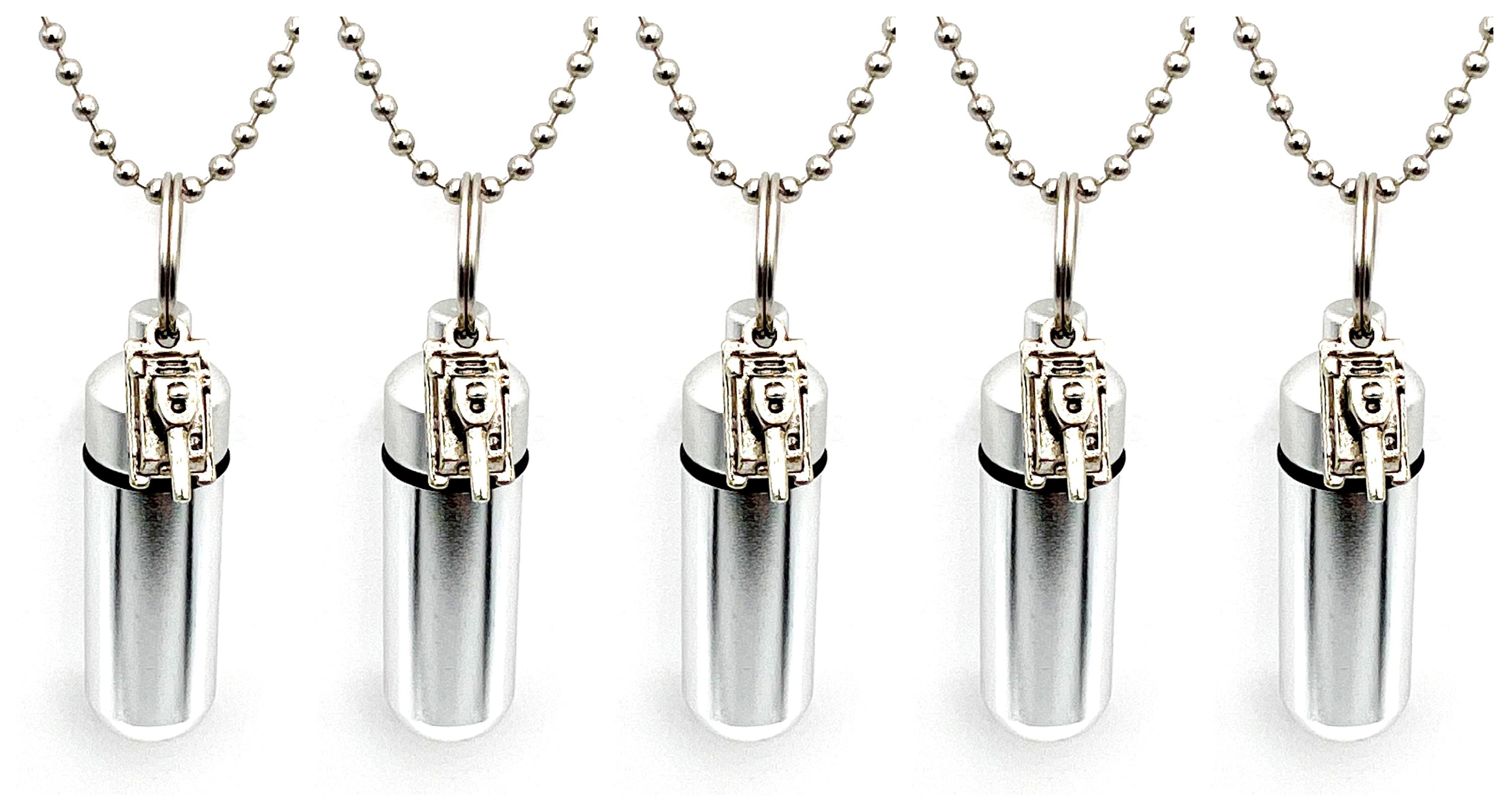 YOU GET FIVE CREMATION URN NECKLACE KEEPSAKES, FIVE VELVET POUCHES, A FILL KIT, AND FIVE STEEL 24" BALL CHAINS.