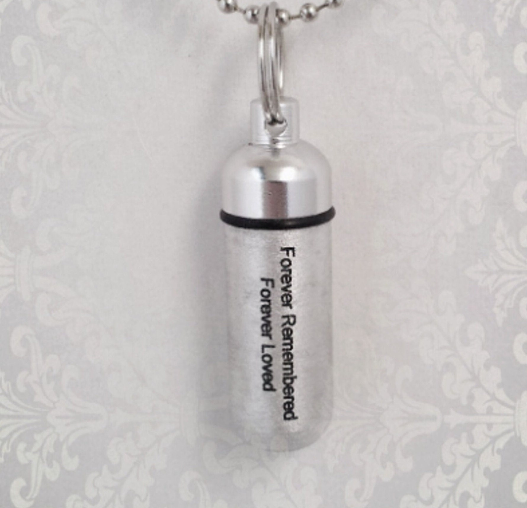 Sturdy, discreet, and secure, this Urn is 1-3/4 inches tall and has a small clear container inside to hold a small amount of your loved ones ashes. Keep them close to you always. Urn is made of aircraft-grade anodized aluminum and will last forever. The urn unscrews to reveal the storage chamber. Inside there is a clear container to keep the ashes safe and dry. A rubber gasket on the screw-on cap provides a waterproof seal. These urns are strong and lightweight enough to carry every day and fits nicely on a keyring or a necklace.