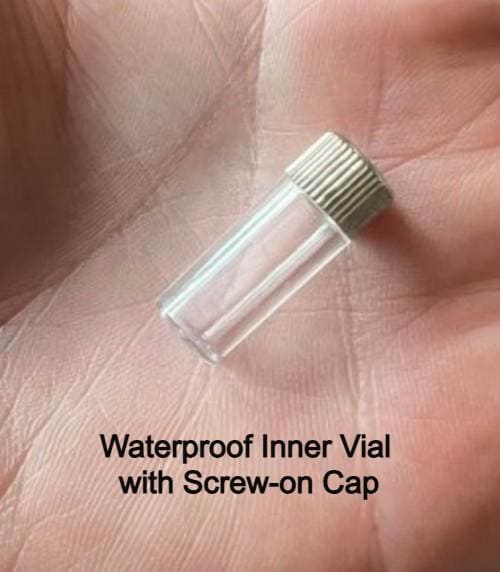 Sturdy, discreet, and secure, this Urn is 1-3/4 inches tall and has a small clear container inside to hold a small amount of your loved ones ashes. Keep them close to you always. It is made of aircraft grade anodized aluminum, and will virtually last forever. The urn unscrews to reveal the storage chamber. Inside there is a clear container to keep the ashes safe and dry. A rubber gasket on the screw-on cap provides a waterproof seal. These urns are strong and lightweight enough to carry every day and fits nicely on a keyring or a necklace.