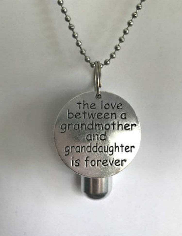 Silver Cremation Urn & container on 24" Steel Necklace with "The Love Between a Grandmother & Granddaughter is Forever"