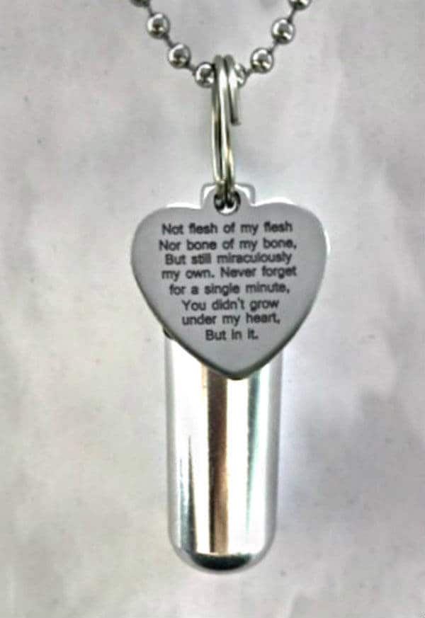 Sturdy, discreet, and secure, this Urn is 1-3/4 inches tall and has a small clear container inside to hold a small amount of your loved ones ashes. Keep them close to you always. It is made of aircraft grade anodized aluminum, and will virtually last forever. The urn unscrews to reveal the storage chamber. Inside there is a clear container to keep the ashes safe and dry. A rubber gasket on the screw-on cap provides a waterproof seal. These urns are strong and lightweight enough to carry every day and fits nicely on a keyring or a necklace.