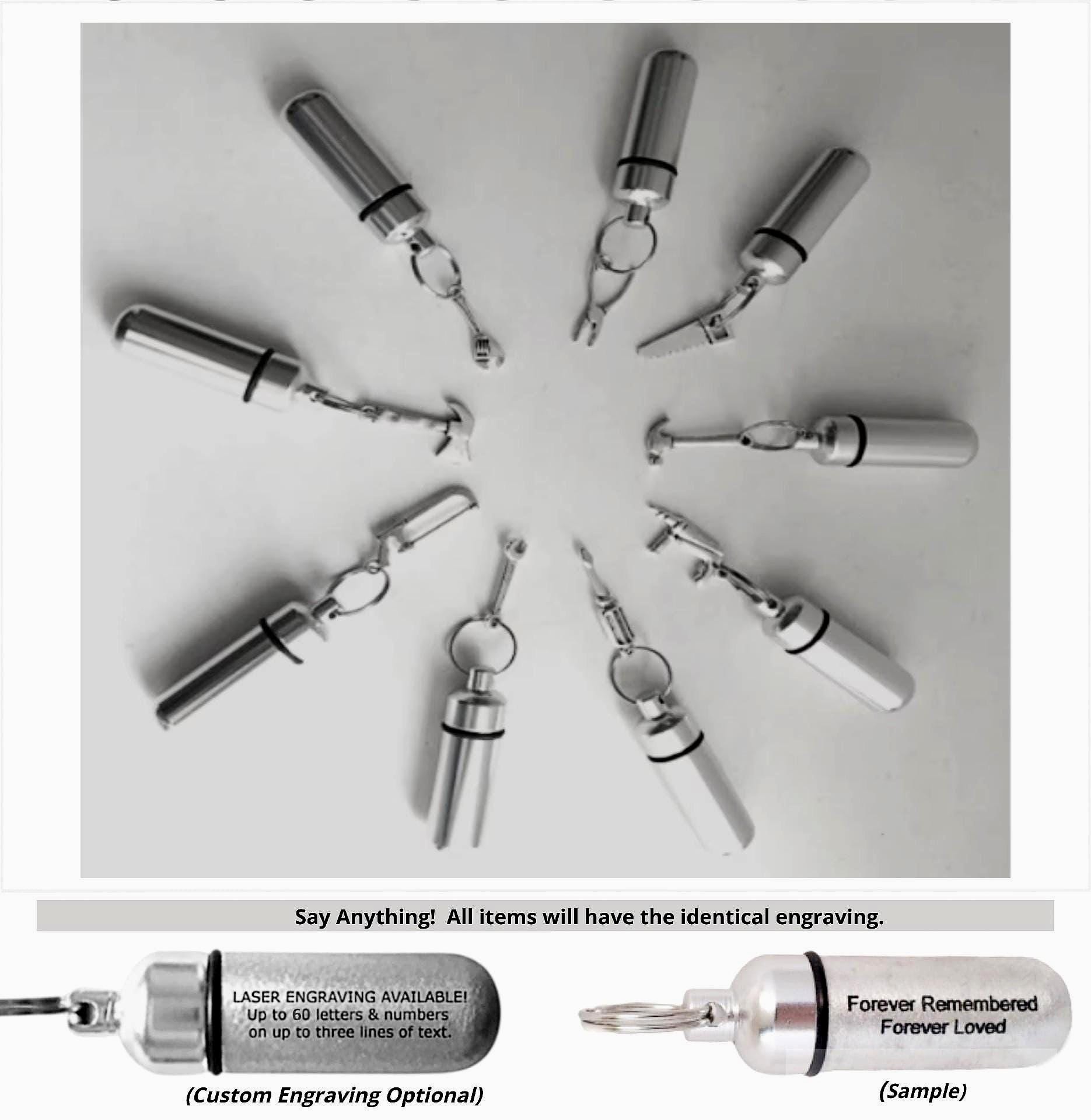 Sturdy, discreet, and secure, this Urn is 1-3/4 inches tall and has a small clear container inside to hold a small amount of your loved ones ashes. Keep them close to you always. Urn is made of aircraft-grade anodized aluminum and will last forever. The urn unscrews to reveal the storage chamber. Inside there is a clear container to keep the ashes safe and dry. A rubber gasket on the screw-on cap provides a waterproof seal. These urns are strong and lightweight enough to carry every day and fits nicely on a keyring or a necklace.