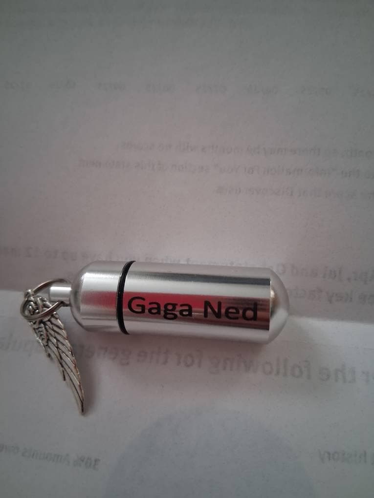 Sturdy, discreet, and secure, this Urn is 1-3/4 inches tall and has a small clear container inside to hold a small amount of your loved ones ashes. Keep them close to you always. It is made of aircraft grade anodized aluminum, and will virtually last forever. The urn unscrews to reveal the storage chamber. Inside there is a clear container to keep the ashes safe and dry. A rubber gasket on the screw-on cap provides a waterproof seal. These urns are strong and lightweight enough to carry every day and fits nicely on a keyring or a necklace.